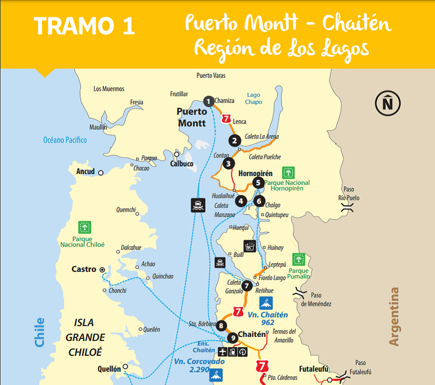 Por fin había llegado el momento mas esperado que era comenzar con la Ruta por la Carretera Austral! Como pudisteis ver en el mapa del comienzo del post y que hace referencia al Tramo 1, hay unos 255 km de carretera entra Puerto Montt y Chaitén pasando por distintos pueblos y lugares como Hornopirén o el Volcán Chaitén pero en esta ocasión no pudimos realizar este tramo debido a que las barcazas y ferris necesarios para completar esta parte del viaje no estaban disponibles en la época que hemos realizado el viaje así que nuestra única opción fue adquirir los billetes para el ferry que sale de Puerto Montt con destino Chaitén.